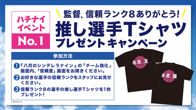 ブース内のキャンペーン窓口にて、『八月のシンデレラナイン』の「チーム強化」画面内、「信頼度」画面を開き、好きな選手の信頼ランクをスタッフに提示しよう。信頼ランク8の選手の推し選手Tシャツを1枚プレゼント。