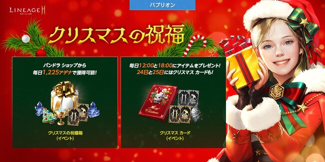 毎日12時にゲーム内郵便にて「クリスマス島の時間補充石(イベント)」などのアイテムをお送りします。さらに、アデン大陸の各村に銅像「クリスマス ツリー(イベント)」が出現します。「クリスマス ツリー(イベント)」に話しかけることで、4時間維持される、「すべてのダメージ +2」「防御力 +1」「命中 +2」のバフを受けることができます。
