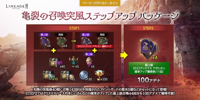 「光輝の突風箱(刻印)」40個に、クラス召喚または2022クリスマス アガシオン確率アップ召喚88回分、「熟練度ボーナス コイン」120個、「祝福されたアインハザードの聖水(刻印)」5個などがセットになった「亀裂の召喚突風ステップアップ パッケージ」が登場しました。それぞれ4回分購入すると100アデナで、「光輝の最上級2022クリスマス アガシオン確率アップ獲得券(11回)(刻印)」4個を獲得できます。