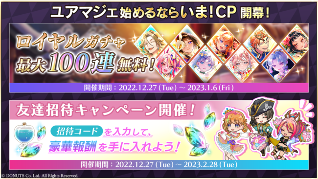 招待コード入力で、ユアマジェ開始から7日間毎日クリスタルやAP回復アイテムをプレゼント!招待した側のユーザーもクリスタルやガチャチケットなどの豪華アイテムがもらえます。