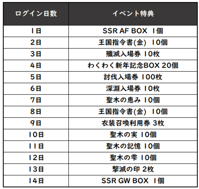 当イベントでは、 SSRグランウェポンやSSRアーティファクトがラインナップに入った「2023新年記念スペシャルログインボーナス」をはじめ、 新規イベント「エーとビーのワンダーランド」「THE・少数決!」など、 多数のイベントを開催している。