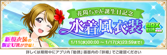 ブシロード<7803>は、KLab<3656>と共同開発したスマートフォン向けアプリ『ラブライブ!スクールアイドルフェスティバル』(スクフェス)において、μ’s小泉花陽誕生日記念キャンペーンの開催を決定した。