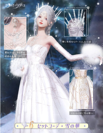 セットコーデ「雪の華」は、雪の結晶をモチーフにしたデザインが特徴の衣装です。白を基調とした生地にシルバーやゴールドの装飾をふんだんにあしらい、全体を覆うように施したファーでドレスをより幻想的な雰囲気に昇華させています。