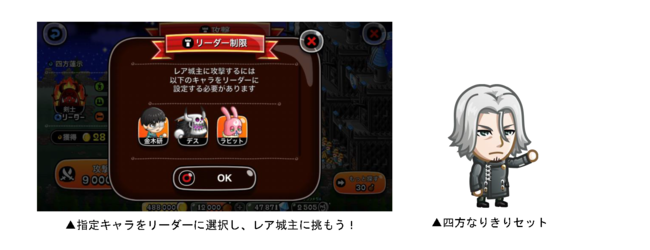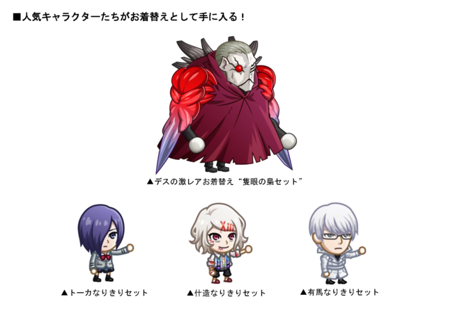 また、レア城主イベントを規定数勝利すると剣士専用の限定お着替え“四方なりきりセット”がプレゼントされる。コラボイベントでは、『東京喰種』作品内の一部シーンがマップになり、バトルBGMも変わるなど、期間限定のコラボを楽しもう。