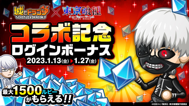 『東京喰種』とのコラボイベント開催を記念して、最大1500ルビーなどがもらえる「ログインボーナス」を開催。期間中、ゲームにログインすると最大14日間、豪華アイテムが1日1回もらえる。