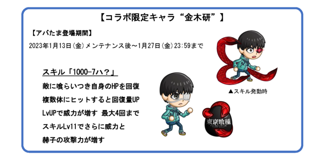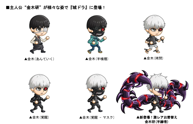 期間中は、コラボ限定キャラ“金木研”が「コラボのアバたま」に登場。今回新たに、コラボ限定キャラ“金木研”の激レアお着替え“金木研(半赫者)”や、城ドラキャラの激レアお着替え“隻眼の梟セット”が登場する。