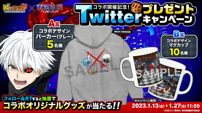 1月13日(金)より「コラボ開催記念!Twitterプレゼントキャンペーン」を実施。『城とドラゴン』公式Twitterアカウントをフォローし、対象ツイートをリツイートした中から抽選で、コラボ限定デザインのパーカーやマグカップをプレゼント。