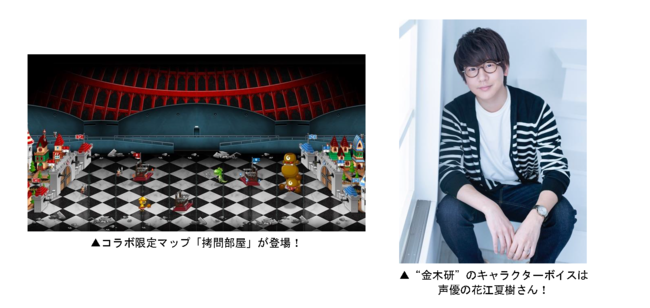 今回新しく登場する、限定キャラ“金木研”の激レアお着替え“金木研(半赫者)”の専用ボイスを、声優の花江夏樹さんが新規収録。また、コラボ期間のみ『東京喰種』作品内の印象的なシーンをモチーフにしたコラボ限定マップ「拷問部屋」が登場する。本マップでは、“金木研”の攻撃力が上昇。“金木研”を使いこなして、バトルに勝利しよう!
