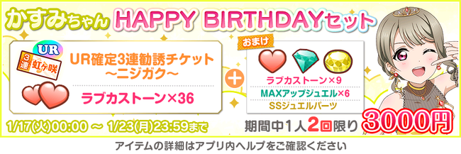 ブシロード<7803>は、KLab<3656>と共同開発したスマートフォン向けアプリ『ラブライブ!スクールアイドルフェスティバル』(スクフェス)において、虹ヶ咲学園スクールアイドル同好会中須かすみ誕生日記念キャンペーンの開催を決定した。