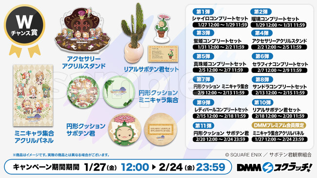 Wチャンス賞には各キャラクターのスペシャルなコンプリートセットの他、今作でのメインストーリーである珠魅たちの故郷をイメージした「アクセサリースタンド」、さらには本物のサボテンが当たるユニークな「リアルサボテン君セット」などここでしか手に入らないラインナップとなっている。