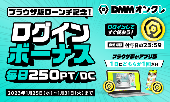 ブラウザ版の登場を記念して、ログインボーナスが期間限定で登場する。1月25日から31日までの7日間、毎日ログインすることで、最大1750pt/DC(1日250pt/DC)獲得できるお得なキャンペーン。