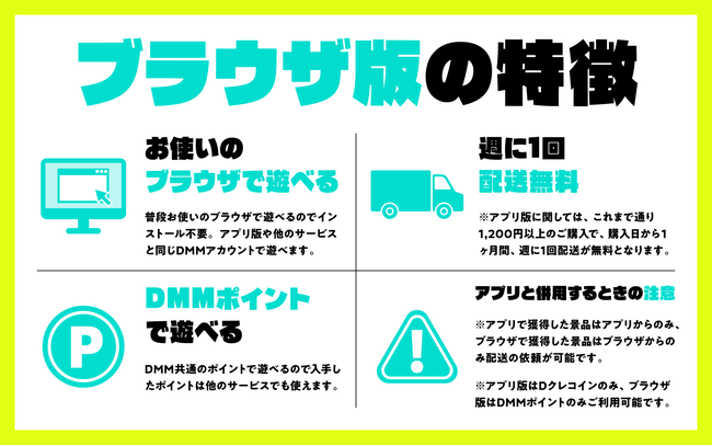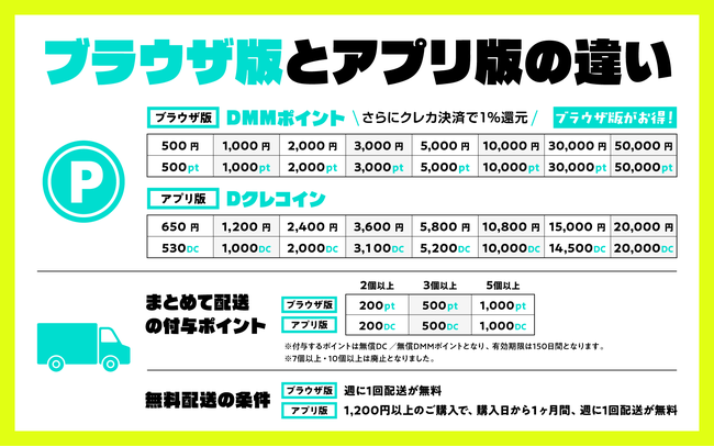 ブラウザ版では、週に1回配送が無料になる。アプリ版では、1,200円以上DC購入した人が対象の配送無料特典が、ブラウザ版ではDMMポイントの購入有無にかかわらず誰でも対象になった。