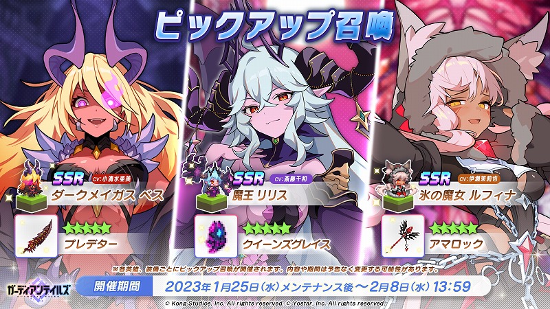 現在、SSR英雄「ダークメイガス ベス(CV:小清水亜美)」「魔王 リリス(CV:斎藤千和)」「氷の魔女 ルフィナ(CV:伊瀬茉莉也)」と★5装備「 両手剣 プレデター」「クロー クイーンズグレイス」「杖 アマロック」のピックアップ召喚が開催中。詳細はゲーム内を確認してほしい。