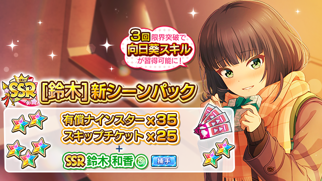 3回限界突破をすることで向日葵スキルを習得可能なSSR鈴木和香(CV.緑川優美)の新シーンパックを販売中。