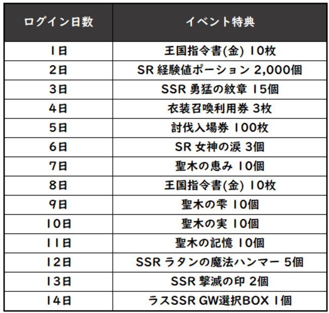 イグノックス登場を記念したスペシャルログインボーナスを開催しております!14日目には「ラスSSRGW選択BOX」も獲得できますので、欠かさずログインしましょう!