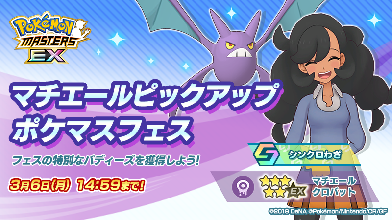 2023年2月17日(金)から、「マチエールピックアップ ポケマスフェス」を開催する。本バディーズサーチでは、「★5マチエール&クロバット」が登場。また、本バディーズは、バディストーンボード拡張済、「★6EX」解放済の状態で登場する。