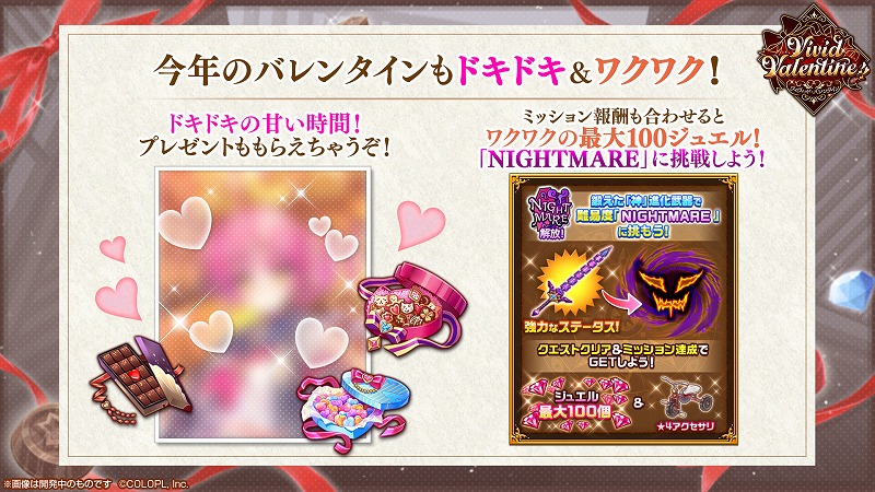 本イベントでは、特定のルーンを集めることでキャラクターからバレンタインチョコをもらえるクエストがある。今回はチョコがもらえるだけでなく、特別なお話もご覧いただくことができる。演出を凝らしたものとなっているので、ぜひ確認してほしい。また、後日イベントの後半として「NIGHTMARE」が解放される。こちらのクエストをすべてクリアすると、最大100個のジュエルを獲得利用できる。
