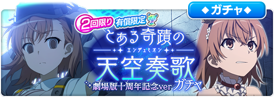 劇場版の十周年を記念して、「2回限り有償限定とある奇蹟の天空奏歌 劇場版十周年記念ver ガチャ」を上記期間中設置する。10体目は★3キャラクターが確定となっており、「【臨時マネージャー】御坂 美琴」、「【黒鴉部隊隊長】シャットアウラ=セクウェンツィア」、「【超電磁投射砲実験装備型】御坂妹」、「【予言巫女】レディリー=タングルロード」のいずれかが排出される。