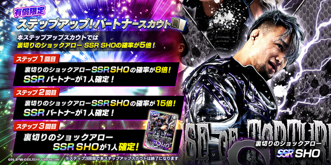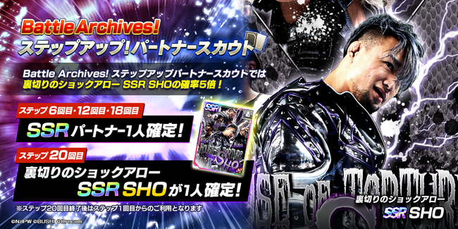新日SSは2023年2月15日(水)メンテナンス終了後から、SSRパートナー「[裏切りのショックアロー]SHO」、が登場する「Battle Archives!ステップアップ!パートナースカウト」を開催。