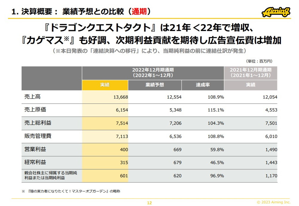 Aiming<3911>の椎葉忠志社長(写真)は、2022年12月通期の決算説明会において、スクウェア・エニックスとの共同タイトル『ドラゴンクエストタクト』の2年目の売上高が初年度のそれを上回ったことを明らかにした。