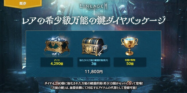 ダイヤ4,290個と「強化された万能の鍵選択箱(希少)(刻印)」3個、「祝福の聖物」50個がセットになった「レアの希少級万能の鍵ダイヤ パッケージ」が登場しました。「強化された万能の鍵選択箱(希少)(刻印)」は、各種「万能の鍵箱(希少)(刻印)」から1つを選択して獲得することができます。「万能の鍵」は、血盟依頼にて対応するアイテムの代替として登録することができます。パッケージの詳細は、公式サイトのお知らせをご確認ください。