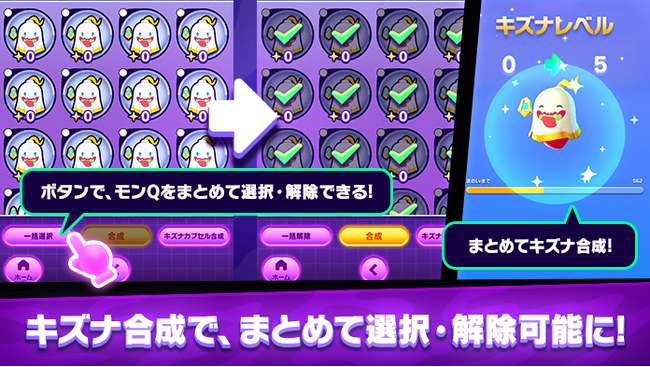 よりスムーズにモンQのキズナ合成ができるよう、モンQをまとめて選択・解除ができるようになる。