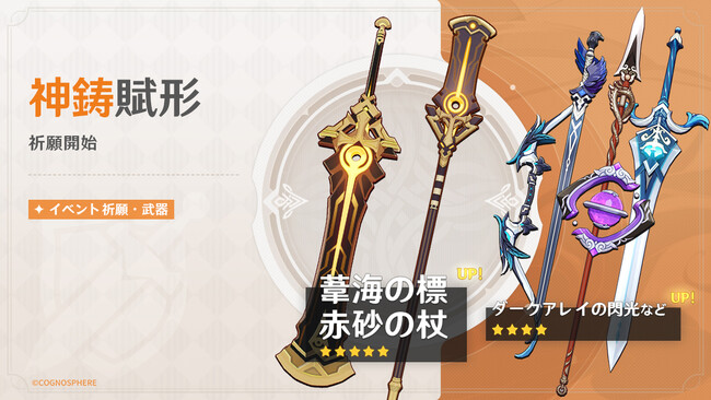 3月1日(水)アップデート後より、イベント祈願・武器「神鋳賦形」を開催。期間中、新★5武器「両手剣・葦海の標」、★5武器「長柄武器・赤砂の杖」などの出現率が大幅にUPする。