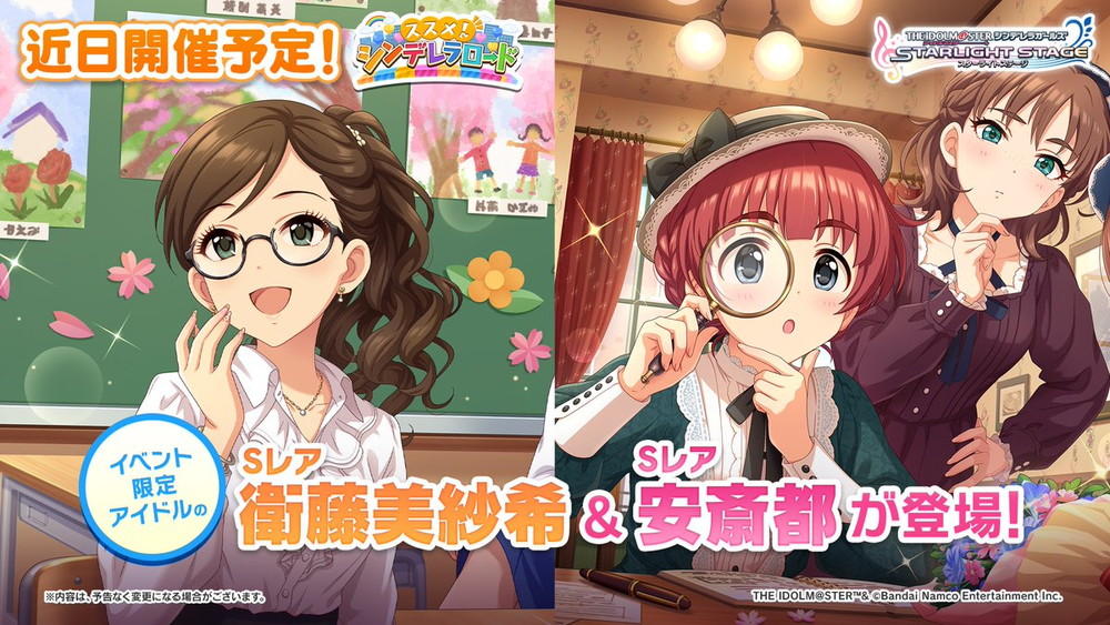 また、イベント「ススメ!シンデレラロード」も近日開催するとのこと。登場する限定アイドルを先行公開した。予定。