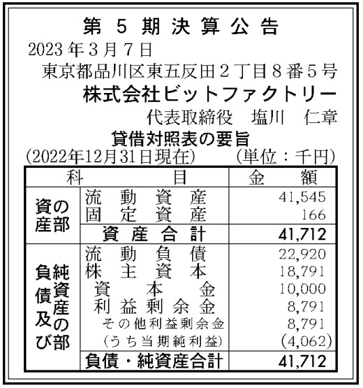 モバイルファクトリー<3912>子会社のビットファクトリーの2022年12月期(第5期)の決算は、最終利益が前の期比で18.7%減の400万円だった。前の期(2021年12月期)の実績は、最終利益が500万円だった。2期連続の黒字となった。本日(3月7日)付の「官報」に掲載された「決算公告」で判明した。