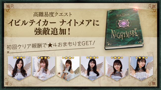 高難易度クエスト「イビルテイカー ナイトメア」に6体の強敵が新たに登場。初回クリア報酬で女神・メルティン・ヒーロー・月うさぎ・宇宙海賊・怪盗ユニットを強化する効果をもつ★4おまもりが獲得できる。