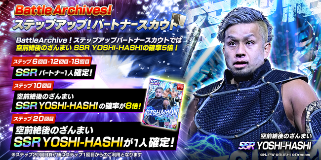新日SSは2023年3月15日(水)メンテナンス終了後から、新規パートナーカードとしてSSR「[空前絶後のざんまい]YOSHI-HASHI」が登場する「Battle Archives!ステップアップ!パートナースカウト」を開催。
