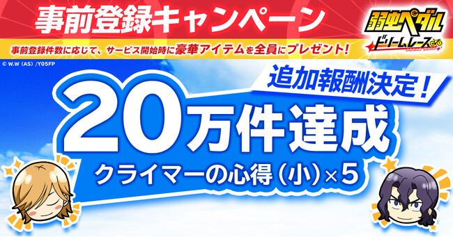 事前登録が10万件を達成したため、小野田坂道が手に入る「小野田坂道の入部届」やその他豪華アイテムのプレゼントが決定。20万件達成で「クライマーの心得(小)×5」を配布予定となっている。