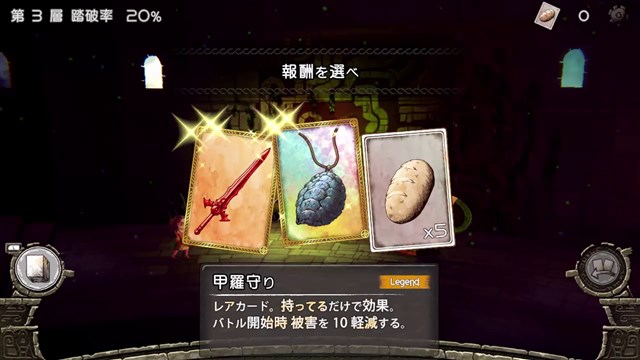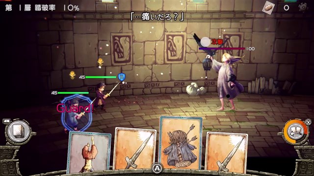 バトルはリアルタイムに進⾏する!敵の攻撃を盾でタイミングよくガードしたり、魔法を重ねて使って威⼒を強化したりと、刻々と変化する状況に合わせ、適切な⼿札を切って戦闘を有利に進めよう!また、カードには上下があり、向きによって効果の変わるものもある。意外な使い道が⾒つかることもあるので、⾊々と試してみるのも楽しみの⼀つだ。