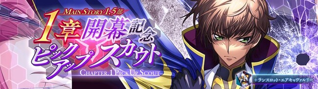 新章追加を記念したスカウトを開催。新パイロット、★4スザク[今はただ力を]が登場。ナイトメアフレーム「ランスロット・エアキャヴァルリー」がついてくる。ピックアップで出現率も上昇中。