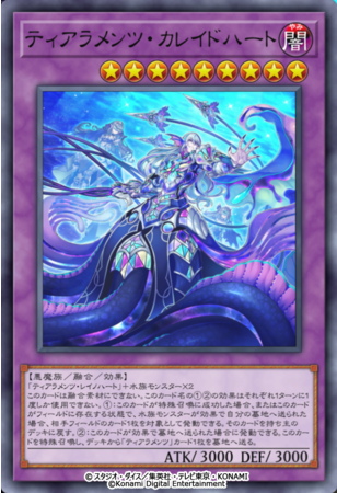 このカードは融合素材にできない。このカード名の1.2.の効果はそれぞれ1ターンに1度しか使用できない。1.:このカードが特殊召喚に成功した場合、またはこのカードがフィールドに存在する状態で、水族モンスターが効果で自分の墓地へ送られた場合、相手フィールドのカード1枚を対象として発動できる。そのカードを持ち主のデッキに戻す。2.:このカードが効果で墓地へ送られた場合に発動できる。このカードを特殊召喚し、デッキから「ティアラメンツ」カード1枚を墓地へ送る。