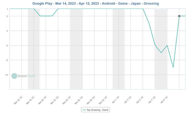 また、Happy Elementsの『あんさんぶるスターズ!!Music』が前日の22位から17位に上昇した。『あんスタMusic』は、4月10日15時より、「フィーチャースカウト ニキ編2」を開催しており、★5「[満腹になる料理]椎名 ニキ」や★4「[苦肉の褒め言葉]高峯 翠」などのキャンペーンカードが登場していることが今回の順位上昇につながっているもよう。