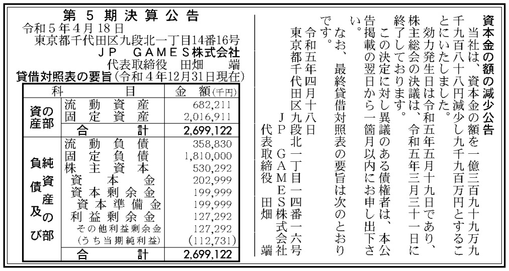 JP GAMESが減資することがわかった。本日(4月18日)付の「官報」に掲載された「資本金の額の減少公告」によると、資本金を1億0300万円減らして9900万円にする。効力発生日は5月19日で、3月31日の株主総会の決議は終了したとのこと。