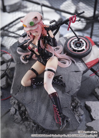 損傷したタイトな衣装から見える健康的なプロポーション、クリアパーツを使いしなやかに垂れるピンクの長髪で彼女の魅力を表現し、銃や靴底に施したウェザリング加工、道路に残ったブレーキ痕で重傷Ver.の世界観を表現しました。