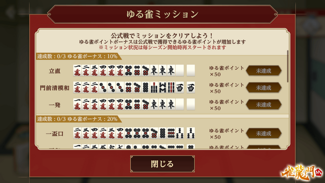 さらに、一定数のミッションをクリアすると、公式戦で獲得できる「ゆる雀ポイント」が増加する「ゆる雀ポイントボーナス」が発動する。