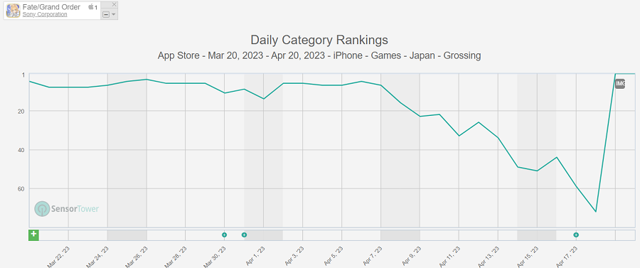 『FGO』は4月19日18時より、「Fate/Grand Order Arcade×Fate/Grand Order コラボレーションイベント開幕直前キャンペーン」を開催すると共に、期間限定サーヴァント「★5 (SSR)ラーヴァ/ティアマト」が新登場する「Fate/Grand Order Arcade×Fate/Grand Order コラボレーションイベント開幕直前ピックアップ召喚」を実施している。この施策が売り上げを伸ばすキッカケになったもようだ。