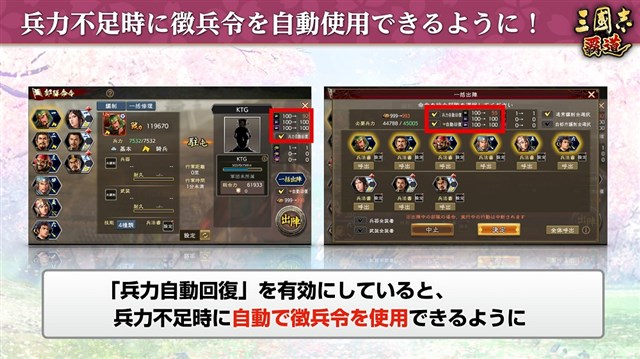 「兵力自動回復」を有効にしていると、兵力不足時に自動で徴兵令を使用できるようになる。