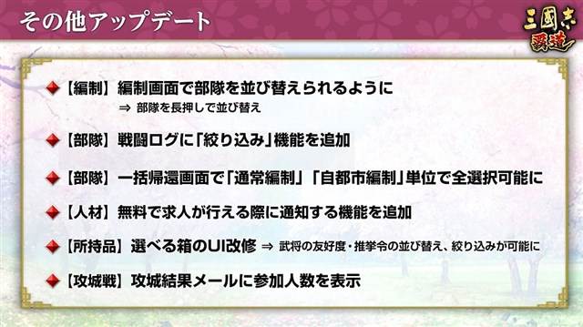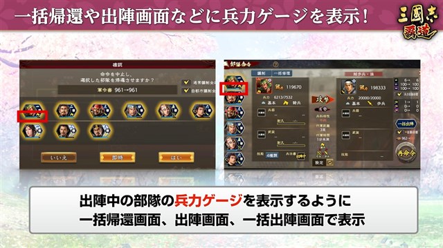 一括帰還、出陣、一括出陣の画面において、出陣中の部隊の兵力ゲージを表示するようになる。