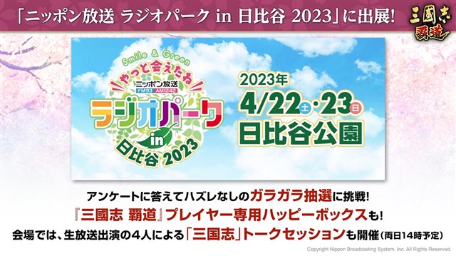 アンケートに答えてハズレなしのガラガラ抽選に挑戦する。生放送を完全再現した『三國志 覇道』プレイヤー専用のハッピーボックスも。両日とも14時から、生放送メンバーによる「三国志」トークセッションを開催する。