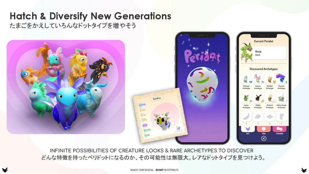 また、ペリドットは、全く同じ個体が存在しないそうだ。見た目や性格などで必ず異なっているという。同社で計算したところ、その種類は「星の数ほど存在する」という(篠原大河氏)。アルゴリズムや計算で「DNA」を導入し、他のプレイヤーのペリドットと交配することで、両親の遺伝を引き継がせて、ハイブリッドなペリドットを生み出すこともできるそうだ。