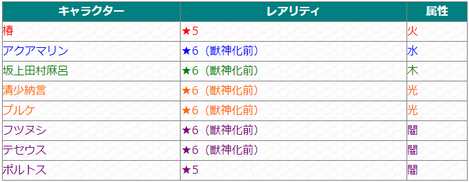 【排出確率UP対象キャラクター】