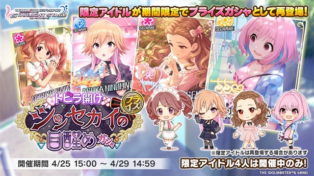 バンダイナムコエンターテインメントは、本日(4月25日)15時より、『アイドルマスター シンデレラガールズ スターライトステージ』において、過去に開催した「愛情たっぷり♡しあわせメイドガシャ」「トビラ開け シンセカイの目醒めガシャ」「歩みは止まらない ! ニューアドベンチャーガシャ」の期間限定アイドルが「プライズガシャ」で再登場することを発表した。