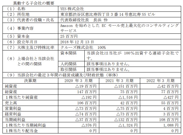 クルーズ<2138>は、4月25日、Amazonを始めとしたECモール売上最大化のコンサルティングサービスを手掛ける子会社YESの全株式をシンメイに5月1日付で譲渡することを発表した。譲渡価額は非開示。