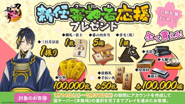 新たにゲームを始めたユーザーを対象に、資源や便利道具などをプレゼント。さらに、今回は刀剣男士「三日月宗近」もプレゼントする。この機会に『刀剣乱舞ONLINE』をプレイしてみよう。