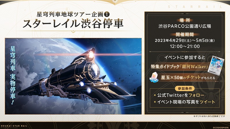 実物の星穹列車が渋谷PARCOに停車するイベント「スターレイル渋谷停車」は2023年4月29日から5月5日までに開催する。イベント参加で星玉×50と交換できるギフトと限定ガイドブック「銀河Walker」を獲得できる。