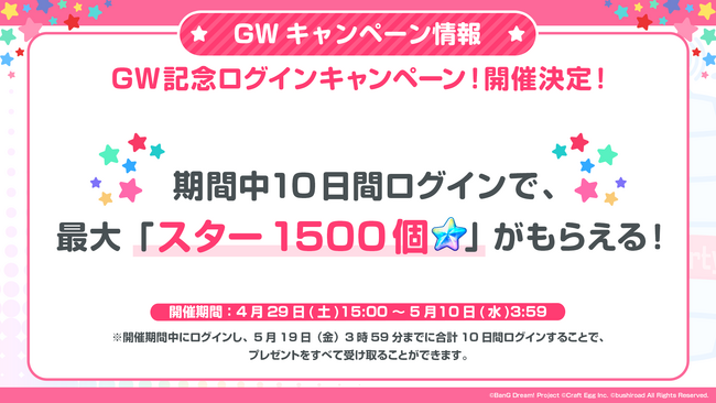 Craft Eggとブシロード、『ガルパ』で最大70回無料ガチャや合計7曲の楽曲追加などのゴールデンウィークキャンペーン情報を発表